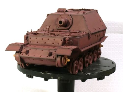 いやぁ~参った。 ジメジメ雨が止んだと思ったらいきなり猛暑に。 連日の暑さでエアブラシを持つ気にもなれず・・・。 毎日ちょっとずつ進めてなんとか塗装を終えました。 フェルディナントの車体塗装を行いますが、ちょっとその前に気付いたことが1点。 ▲…