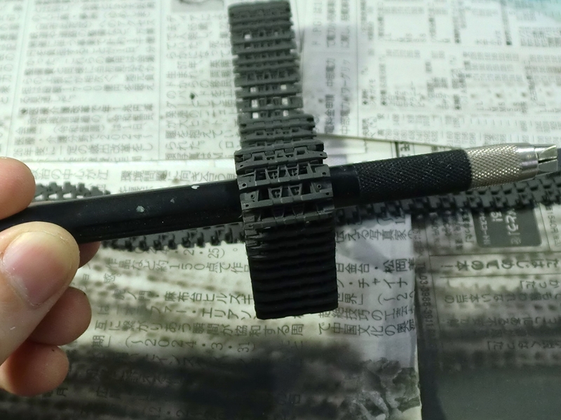 履帯は新品の感じを出したいのでいつもの履帯染めはやらず、黒っぽい色で下地をつくります。